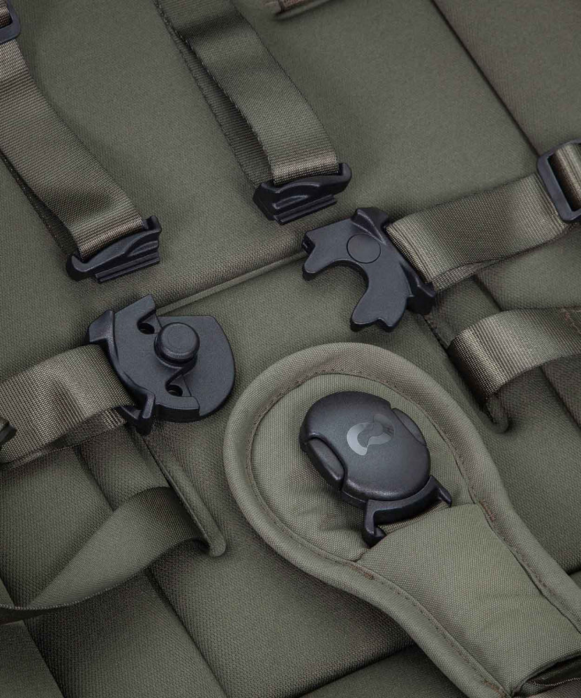 Hamul de siguranta este reglabil, are protectii moi pentru umeri si clema de blocare magnetica.