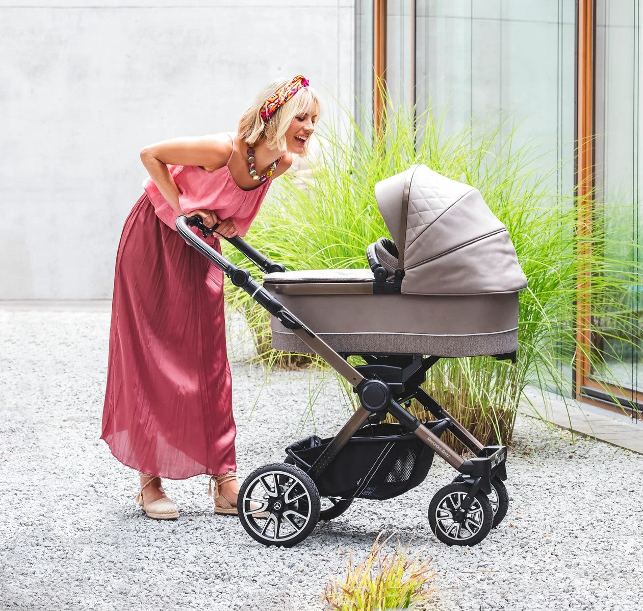 Logo-ul Mercedes-Benz este afișat în mod proeminent atat pe cadrul și pe materialul textil al căruciorului, precum și pe accesorii